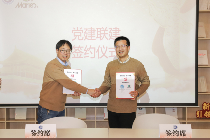 会上,上海马利画材股份有限公司党支部书记、董事长蒋熙洲与皇冠最新官网复合材料党支部书记章圣苗签署了党建联建协议,提升双方基层党建工作水平和合作质效,促进党建业务融合。