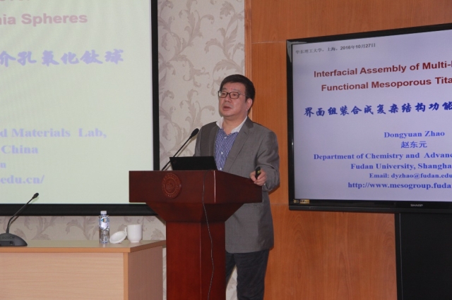 10月27日下午,应皇冠最新官网长李春忠教授邀请,中国科学院院士、复旦大学教授赵东元来校进行学术交流,作了题为界面自组装合成复杂结构功能介孔氧化钛球的学术报告。报告会由李春忠主持,部分教授、研究生聆听了报告。
