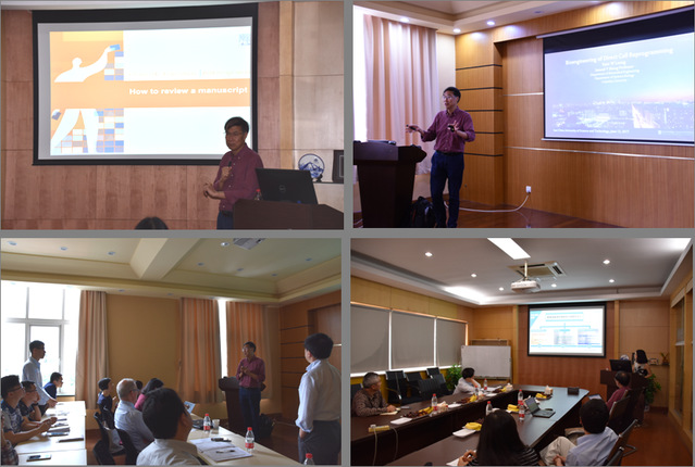 访问期间,Leong教授为皇冠最新官网师生带来了两场报告,分别为“Bioengineering of Direct Cellular Reprogramming”和“How to publish on Biomaterials”。报告会由刘昌胜主持。Leong教授首先介绍了直接细胞重编程技术。直接细胞重编程是指不经过中间干细胞的阶段,直接将成熟细胞从一个谱系经过重编程转化为另一个谱系,产生能应用于再生医学的细胞。它避免了药物及胚胎的使用,并最大限度地降低了将诱导的多功能干细胞应用于人体导致畸胎瘤形成的风险。它还可以产生用于疾病建模和药物筛选的细胞。随后,Leong教授介绍了目前他们的团队通过直接细胞重编程技术将人内皮祖细胞(hEPC)转化为诱导的平滑肌细胞(iSMC),将hEPC转化成诱导的骨骼肌细胞(iSkM),以及将人成纤维细胞转化成诱导的心肌细胞样细胞(iSML),并将小鼠成纤维细胞转化成诱导的神经元。在第二场报告中, Leong教授针对如何撰写学术文章以及文章投稿、审稿等大家关心的话题作了详细介绍。