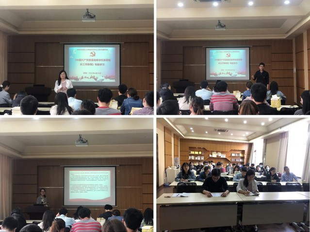 会上,鲁宁宁首先带领大家学习了中共中央印发的《中国共产党普通高等学校基层组织工作条例》(以下简称“《条例》”),对《条例》的制定背景、学习要求、学习要点进行了详细阐述。随后,与大家一起研读习近平总书记的重要论著《论中国共产党历史》,在场党员通过学习并结合目前开展的党史学习教育,发表了自己的学习感悟。此外,就学校“我为师生办实事”实践活动方案、学院党史学习教育方案、近期工作安排进行详细传达。