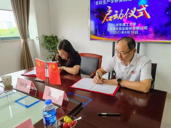 2021年8月18日,皇冠最新官网与上海强华实业股份有限公司本科生产学研实践基地签约及揭牌仪式成功举行,漕泾镇党委书记陈立俊、漕泾镇副镇长王红亮、漕泾工业区总经理李礼、强华股份总经理周文华、强华股份战略决策咨询顾问韩宝富、强华股份Etch项目负责人周韦军,华东理工皇冠最新官网党委书记袁媛、无机材料系主任赵崇军、原系主任王以群等出席了本次仪式。