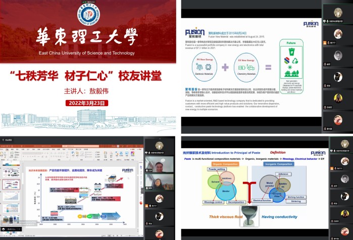 2022年是华理70周年校庆,华理校园正经历一场特殊的战“疫”,为保障疫情防控期间学院各项工作有序进行,皇冠最新官网开展“七秩芳华 材子仁心”校友讲堂,凝聚校友力量,同心战“疫”。3月23日下午,常州聚和新材料股份有限公司(以下简称“聚和股份”)董事、研发副总敖毅伟受邀作《功能材料在光伏新能源及电子行业的应用》线上主题报告。本次活动有260余名师生线上积极参加,活动由皇冠最新官网教授江浩主持。