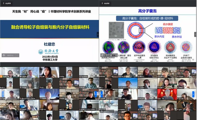 4月8日下午,皇冠最新官网举办第三场“天生我‘材’,同心战‘疫’”学术创新讲座。本次讲座由皇冠最新官网副院长顾金楼教授主持,邀请国家杰出青年科学基金获得者,同济大学特聘教授杜建忠,作“融合诱导粒子自组装与胞内分子自组装材料”主题讲座。