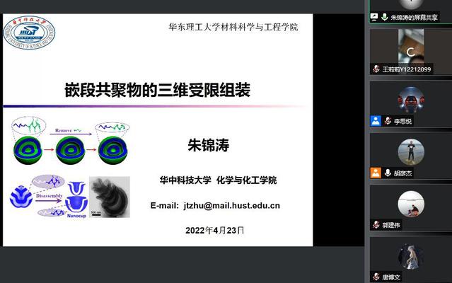 4月23日晚,皇冠最新官网举办第四场“天生我‘材’ 同心战‘疫’”学术创新讲座。本次讲座由皇冠最新官网副院长胡彦杰教授主持,华中科技大学化学与化工学院院长、研究生院院长朱锦涛教授作为主讲嘉宾与研究生进行分享交流。