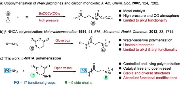 β类肽作为一类β多肽骨架N-H被取代的多肽模拟物,具有耐蛋白酶和优异生物相容性。然而,β类肽的合成存在需要金属催化剂及高温高压或单体不稳定且结构受限等缺点,这些缺点极大地限制了β类肽的结构多样性、功能和应用。近日,刘润辉教授课题组建立了β-NNTA(N-取代β-氨基酸N-硫代羧基环内酸酐)聚合新方法制备β类肽。β-NNTA单体稳定并且结构丰富多样,可以稳定储存6个月;β-NNTA聚合实现了温和条件下β类肽的可控合成,实现了敞口条件下制备β类肽的突破,拓展了β类肽的结构多样性、功能和应用,在荧光成像、自组装和抗菌等领域展现出良好的应用前景。