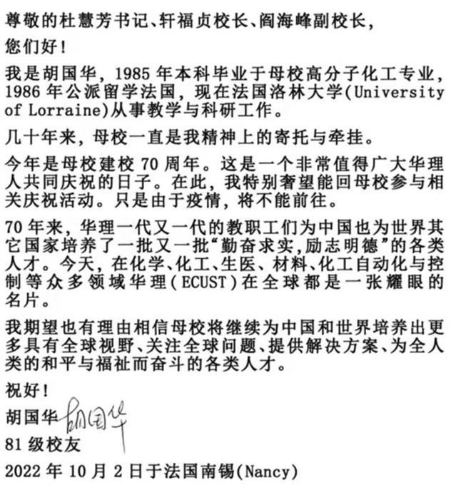 正值华理七十周年校庆,胡院士表达了对母校的思念与感谢,他在“给母校的一封信”中提到,“母校一直是我精神上的寄托与牵挂,今天,在化学、化工、生医、材料、化工自动化与控制等众多领域,华理在全球都是一张耀眼的名片……”。