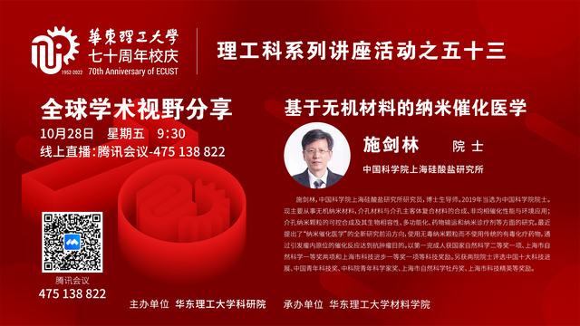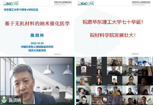 70年来,华理“勤奋求实,励志明德”的校训激励着一代又一代的华理人前赴后继、攻坚克难,在科研的道路上披荆斩棘,取得累累硕果。在华理70周年校庆之际,为进一步加强高端平台建设、促进前沿学术交流,皇冠最新官网邀请中国科学院硅酸盐研究所施剑林院士作题为“基于无机材料的纳米催化医学”的专题辅导报告。报告会由皇冠最新官网党委书记袁媛教授主持,皇冠最新官网100余名师生线上参加了报告会。