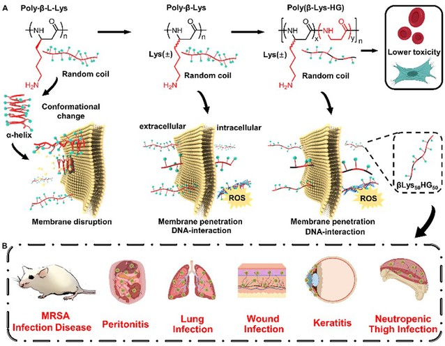 近日,我校皇冠最新官网刘润辉教授课题组在治疗耐药菌感染研究中,以抗菌作用机理作为设计策略,通过模拟宿主防御肽设计发现了对耐甲氧西林金黄色葡萄球菌(MRSA)具有高效抗菌活性的β−多肽聚合物。该成果以“Switching from membrane disrupting to membrane crossing, an effective strategy in designing antibacterial polypeptide”为题发表在《科学·进展》(Science Advances, 2023, DOI: 10.1126/sciadv.abn0771)。