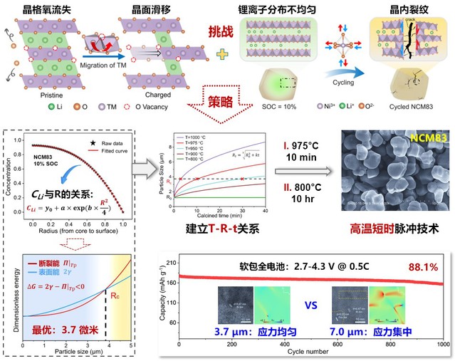 在这项工作中,以LiNi0.83Co0.12Mn0.05O2(NCM83)正极材料为例,根据菲克第二定律和电流分布理论,建立了锂浓度分布与粒径R之间数学关系。将其带入锂离子扩散诱导的应力模型,动态定量描述了单晶颗粒应力分布,澄清了应力与粒径的动态关系,建立了断裂能与表面能随粒径变化的关系曲线,实现了长寿命大单晶粒径的理论预测,结果显示NCM83最佳颗粒尺寸为3.7微米。对于该单晶的合成,首先基于Ostward熟化定律,建立了温度-粒径-煅烧时间之间的关系,发展了高温短时脉冲锂化技术精准调控高质量单晶粒径的新方法,成功合成了粒径3.7微米的NCM83单晶颗粒,其应力分布更加均匀,软包全电池循环1000周后,容量保持率高达88.1%。这项工作为设计和合成具有优异循环稳定性的高比能单晶富镍三元正极材料提供了重要的理论指导和技术支持。
