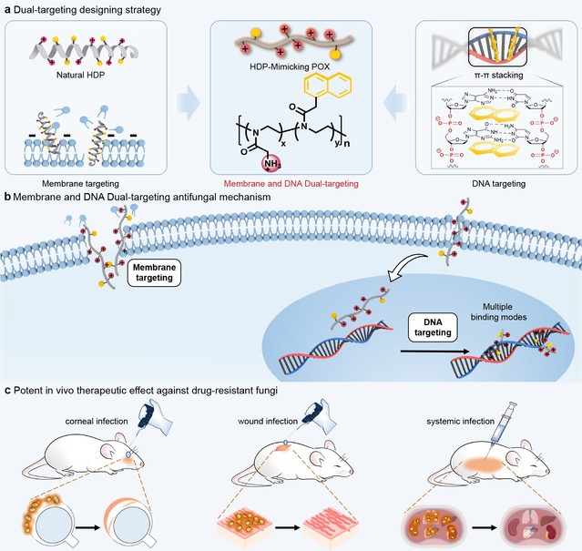 临床抗真菌药物数量有限且往往伴随着严重的毒副作用,导致真菌感染对人类健康构成重大威胁,真菌耐药性的迅速出现和传播加剧了这一现状。双靶点药物有望通过作用于微生物的多个途径显著降低真菌耐药发生,在药物研究中具有很大前景。尽管临床中通过两种药物联用的替代方案实现双靶点抗耐药真菌,但两种药物在体内的分布和药代动力学各不相同,使得治疗效果受到限制。真菌和哺乳动物细胞同作为真核细胞结构高度相似,导致抗真菌靶点有限,即使发现单一靶点的选择性抗真菌分子也极其困难。因此,双靶点药物在抗真菌研究领域一直未取得突破。刘润辉教授课题组在前期研究中,提出了以优异生物安全性的聚噁唑啉(多肽主链上酰胺键转移至侧链)模拟天然多肽,创新性地实现了基于聚噁唑啉骨架的功能性多肽模拟,发现了体内外高效抗耐药细菌和耐药真菌的聚噁唑啉活性分子(Angew. Chem. Int. Ed.2020, 59, 6412,VIP论文,ESI高被引;Angew. Chem. Int. Ed. 2022, 61, e202200778,VIP论文;J. Am. Chem. Soc.2023, 145, 25753,JACS Spotlight)。本研究中进一步提出通过正电荷和两亲性的聚噁唑啉模拟宿主防御肽同时引入DNA结合基团作为疏水性结构的设计策略,通过调控正电荷和DNA结合基团的比例成功获得了高活性、高选择性双靶点抗耐药真菌新分子。双靶点活性分子对多种临床常见耐药真菌(包括念珠菌属、新生隐球菌、格特隐球菌和烟曲霉菌)具有高活性和高选择性,在角膜炎、擦伤、系统感染等多个小鼠感染模型中展示优异治疗耐药真菌感染效果,为抗耐药真菌药物研究和应对抗真菌耐药性挑战提供了新思路。