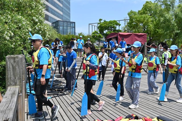 早上7点,部分校友相聚梅陇路130号,乘坐校车前往奉贤校区。8点半,队员们换好队服,在北岸码头集合,在欢声笑语中开始训练,在教练和领队的指导下,队员们迅速体会动作要领。对于赛龙舟而言,不单要有力量与气势,队员们同心协力、默契配合更为关键。