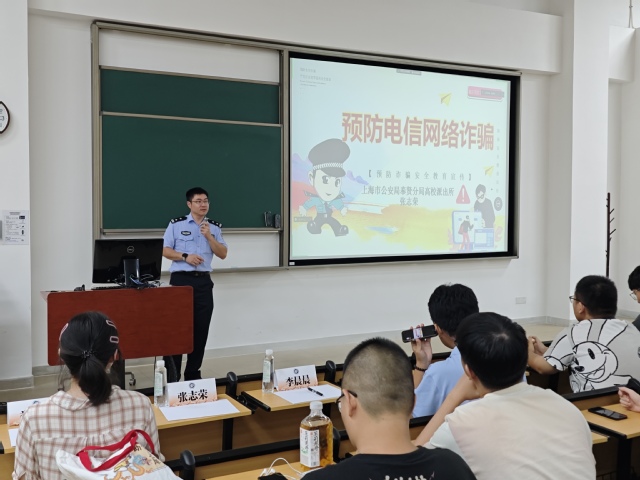 9月5日,皇冠最新官网2024级研究生新生校史学习和安全培训会在奉贤校区D200举行。上海市公安局奉贤分局高校派出所张志荣警官和校安全环保办公室李晨晨受邀作辅导讲座。会议由研究生辅导员娄梦蝶主持。